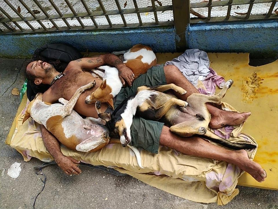 A imagem é forte e chama atenção para a realidade de quem vive nas ruas e que muitas vezes não enxergamos. Mas os animais sempre enxergam, sem distinção de absolutamente nada.