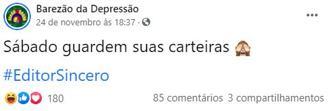 Na tentativa de ser engraçado, a página conhecida como “Barezão da Depressão”, publicou a seguinte frase: ‘Sábado, guardem suas carteiras #Editorsincero”, que deu a entender que todos os paraenses são ladrões.