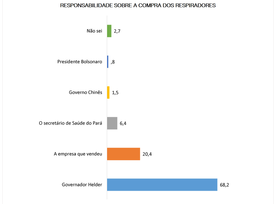 Com relação à polêmica compra dos respiradores que não funcionavam e, portanto, não puderam servir aos pacientes com a forma mais grave da Covid-19, 68,2% dos paraenses afirmam que a responsabilidade por esse episódio fatídico é do governo do Pará. 20,4% dizem que é da empresa que vendeu; 6,4% afirmam que a responsabilidade é do secretário de saúde. E 1,5% do Governo Chinês.