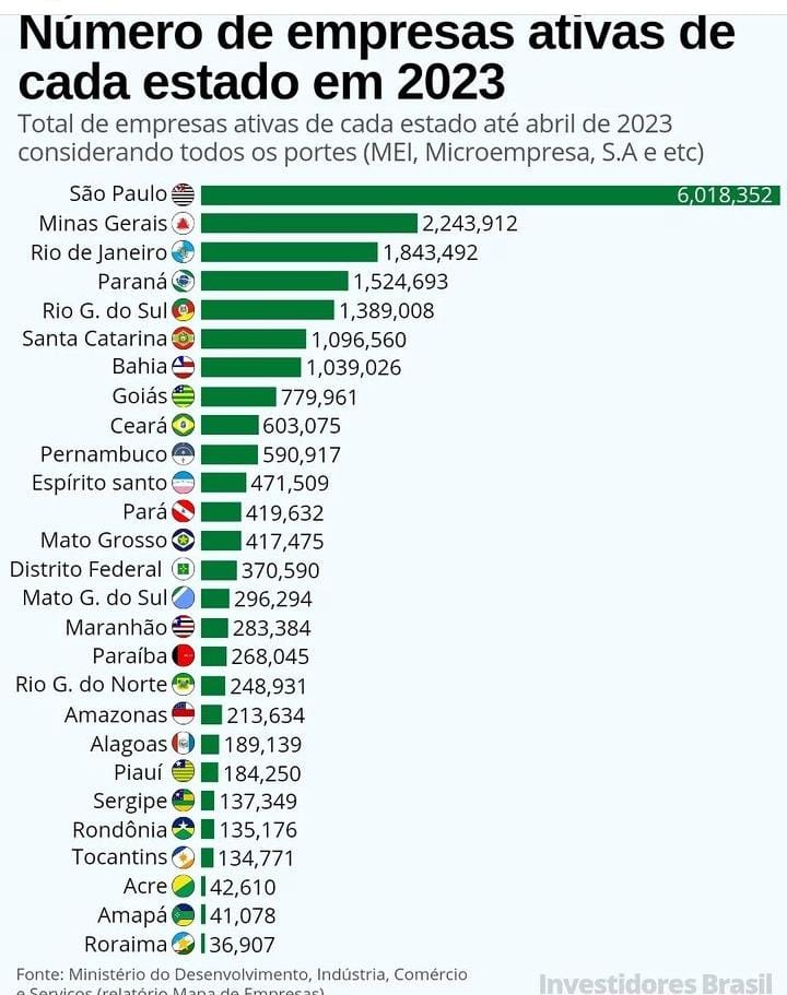 Quando observamos o ranking nacional, o Pará possui um total de 419.632 empresas formalizadas até abril de 2023, ficando atrás de outros estados com faixas populacionais semelhantes, como Santa Catarina, Goiás, Pernambuco e Ceará.
