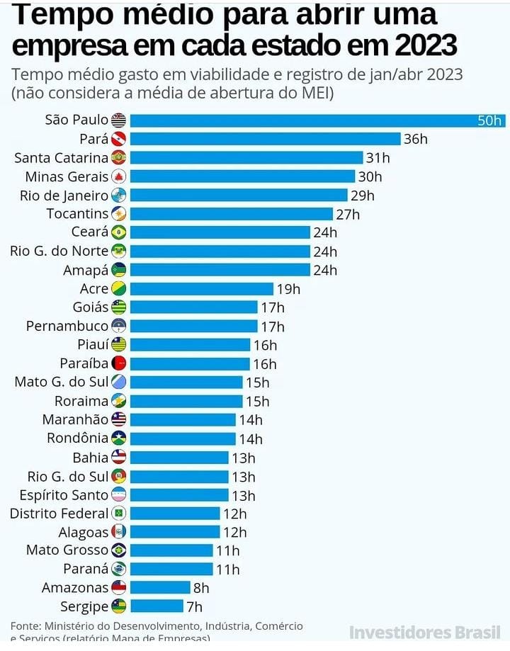 Tempo médio para abrir uma empresa nos estados brasileiros. Foto: Reprodução