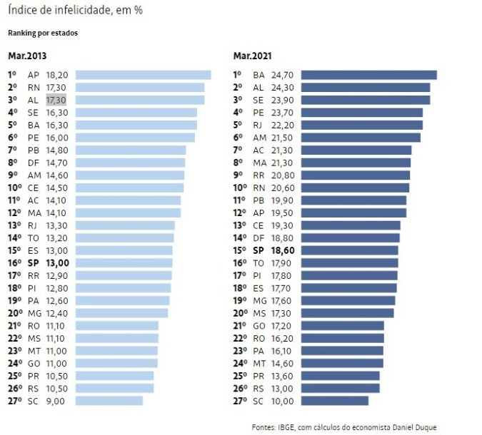 No outro lado, os maiores índices de infelicidade, ou menores de felicidade ocorreram onde há menos oferta de postos de trabalho. Em 2021, a Bahia ficou no topo dos estados mais infelizes com índice de 24,7%, seguida por Alagoas com 24,3% e Sergipe, 23,9%. Pelo índice, os estados com mais pessoas infelizes estão no Norte e Nordeste.