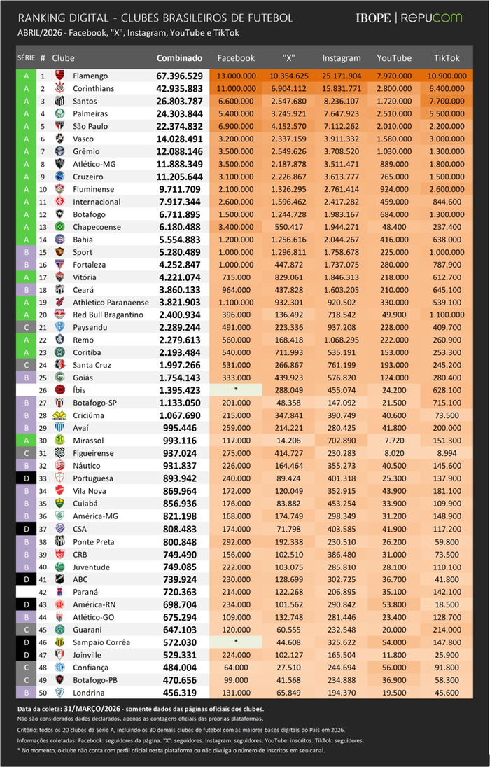 No cenário nacional, o Flamengo segue liderando com folga a base digital, seguido por Corinthians e Santos, que também registraram crescimento expressivo no primeiro trimestre de 2026.