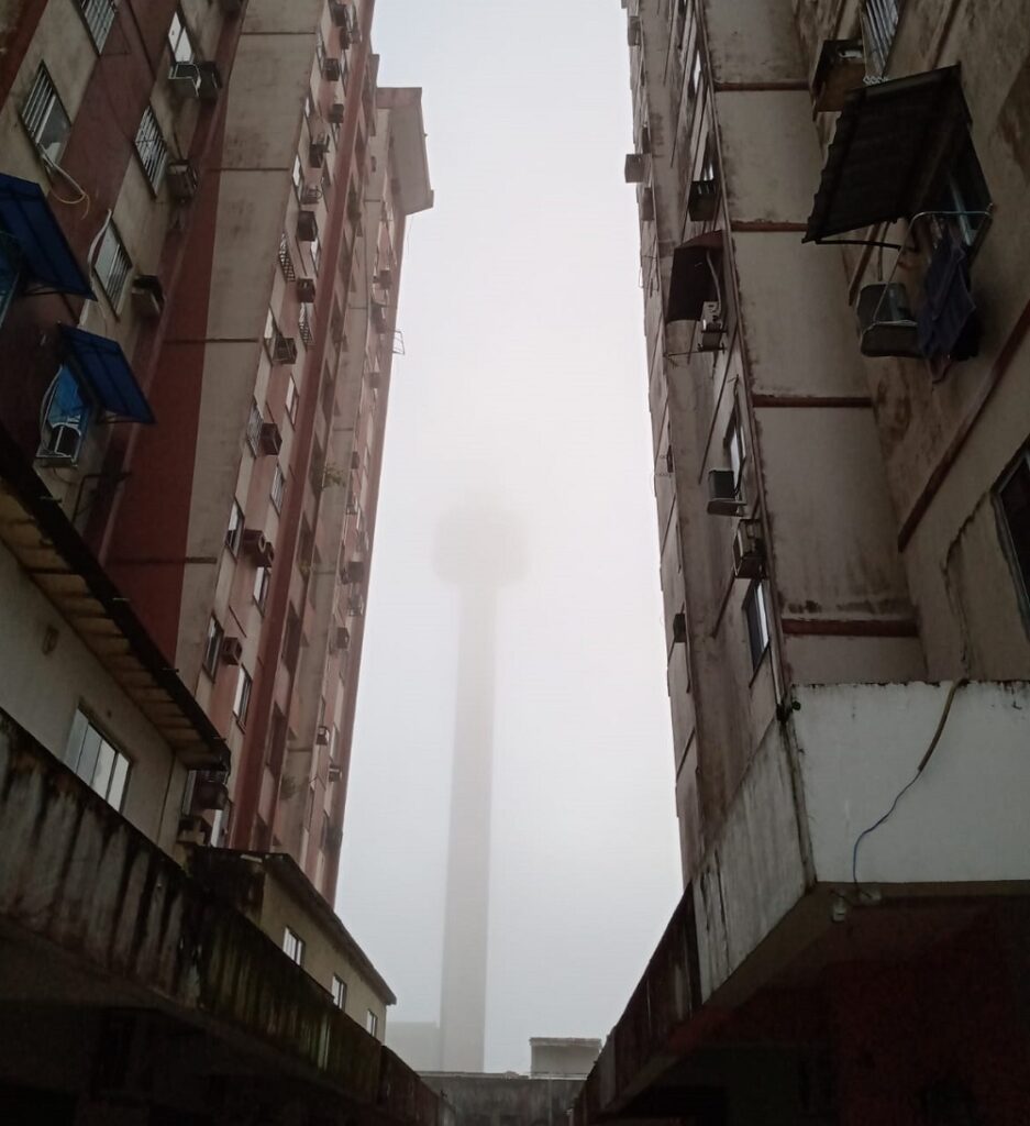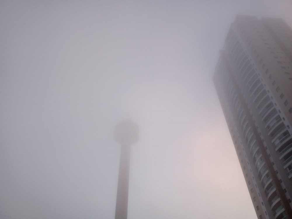 O bairro do Marco sob forte neblina, com a torre da RBA TV quase desaparecendo (foto de Elias Gonçalves)