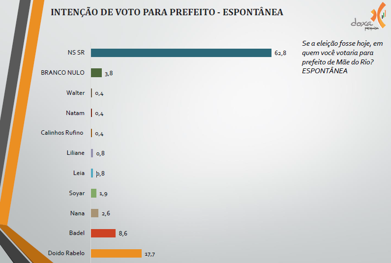 Espontânea – Na pergunta espontânea, em que não se apresentam os nomes dos pré-candidatos, Doido Rabelo aparece na frente com 17,7% das intenções de voto. Em segundo lugar vem Badel com 8,6%. Nana ficou com 2,6%; Soyar aparece com 1,9%; Leia e Liliane ficaram com 0,8 %. Carlinhos, Natam e Walter, todos ficaram com apenas 0,4%. Os eleitores indecisos e os que têm intenção de anular ou votar em branco somam 66,6%.