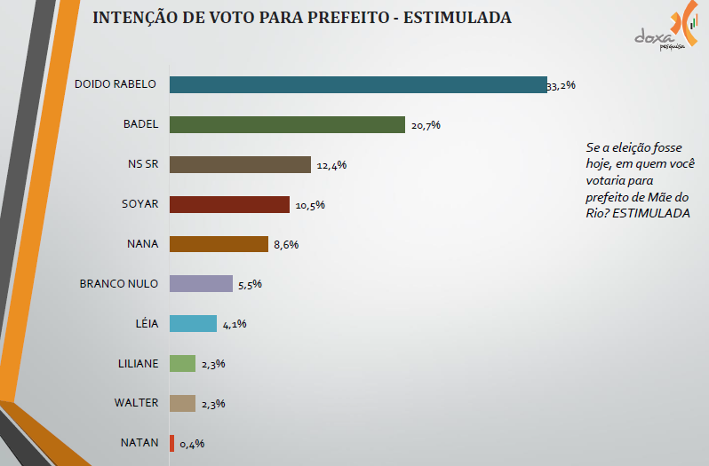 Se a eleição fosse hoje, o atual prefeito de Mãe do Rio, Doido Rabelo, se reelegeria para mais um mandato como prefeito da cidade, que fica na região nordeste do Pará. O resultado é apontado na primeira pesquisa registrada no Tribunal Regional Eleitoral (TER), sob o número PA 06669/2020 da empresa Doxa Pesquisa realizada no período de 23 a 26 de junho de 2020, com 300 entrevistas aplicadas nas áreas urbana e rural do município. Doido Rabelo se reelegeria com 33,2% das intenções de voto.