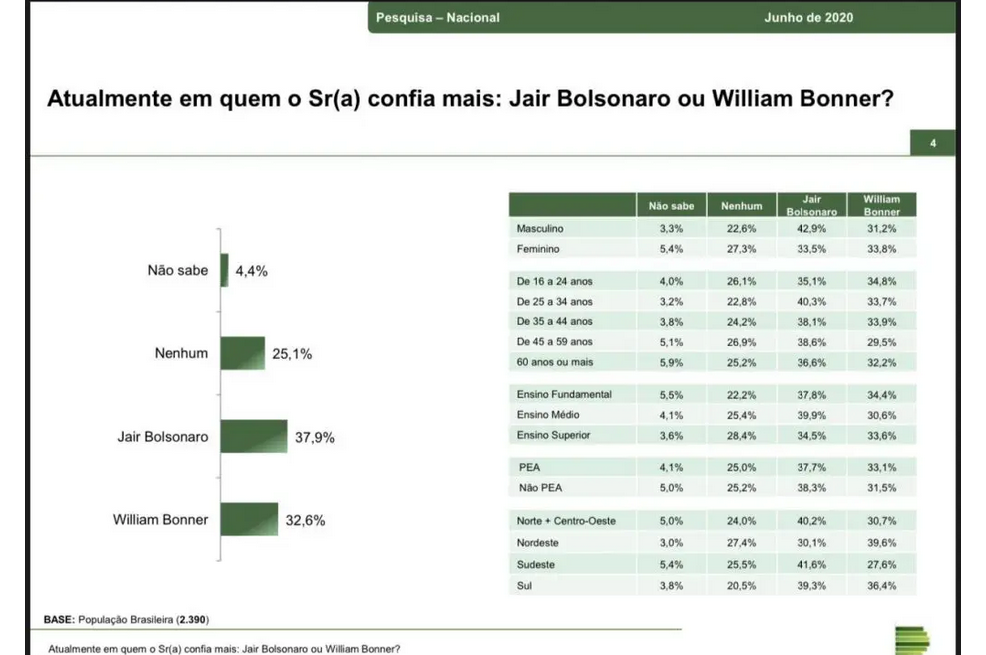 Levantamento do Paraná Pesquisa para o Diário do Poder e esta coluna avaliou em quem o brasileiro confia mais, atualmente, se no presidente Jair Bolsonaro ou William Bonner, apresentador do Jornal Nacional, alvo frequente de críticas dos bolsonaristas. O presidente foi escolhido por 37,9% do total, enquanto 32,6% acham que o jornalista merece mais credibilidade. Nenhum dos dois foi a escolha de 25,1% e outros 4,4% não sabem. O Paraná Pesquisa ouviu 2.390 pessoas em todo o País. A informação é da Coluna Cláudio Humberto, do Diário do Poder.