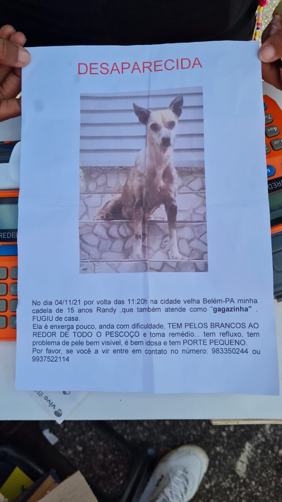 O animal de porte pequeno, tem pelos brancos aos redor do pescoço e atende pelos nomes Randy ou “gagazinha”. Ela tem 15 anos e está com pouca visão e dificuldades de se locomover. Quem encontrar ou tiver pistas sobre onde a cadela possa estar, pode entrar em contato através do número (91) 98335.0244 .