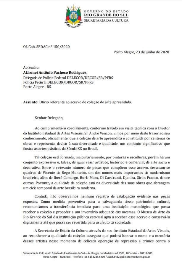 A coleção é tão expressiva que a secretária de Cultura do Rio Grande do Sul, Beatriz Araújo, encaminhou à PF há pouco um ofício, obtido por O Antagonista, solicitando a transferência do acervo para o Museu de Arte do estado.