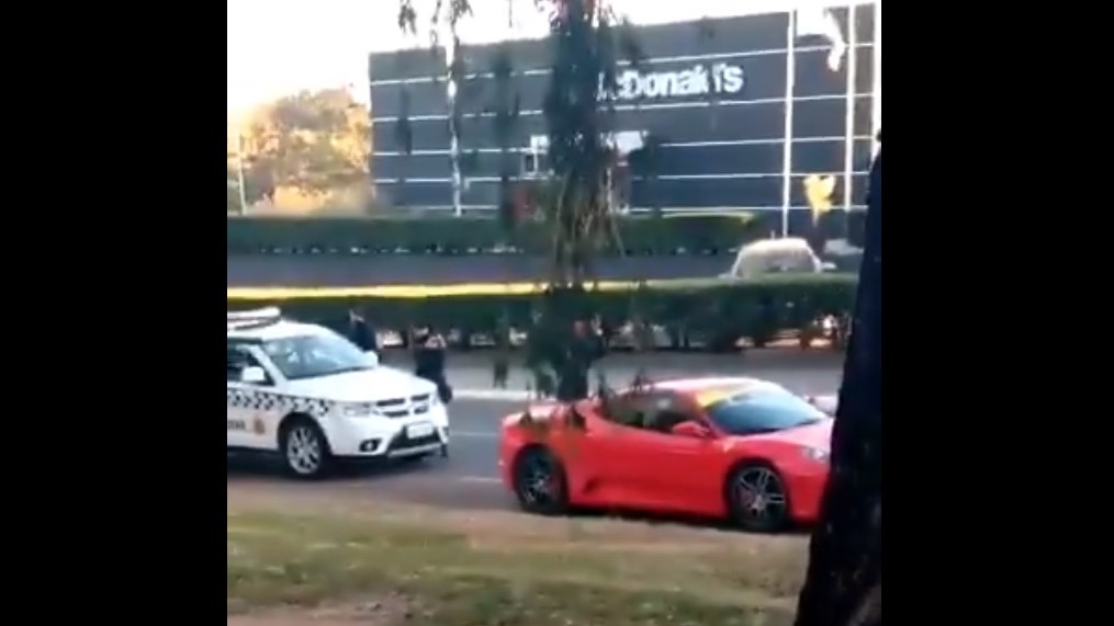 O vídeo de um policial militar abordando o motorista de uma Ferrari no Distrito Federal viralizou nas redes sociais. Na gravação é possível ouvir os agentes pedindo para o motorista deixar o carro de luxo. “Abre as pernas, mão na cabeça. Quero saber quem é você, não”, grita o policial. As informações são do portal Metrópoles.