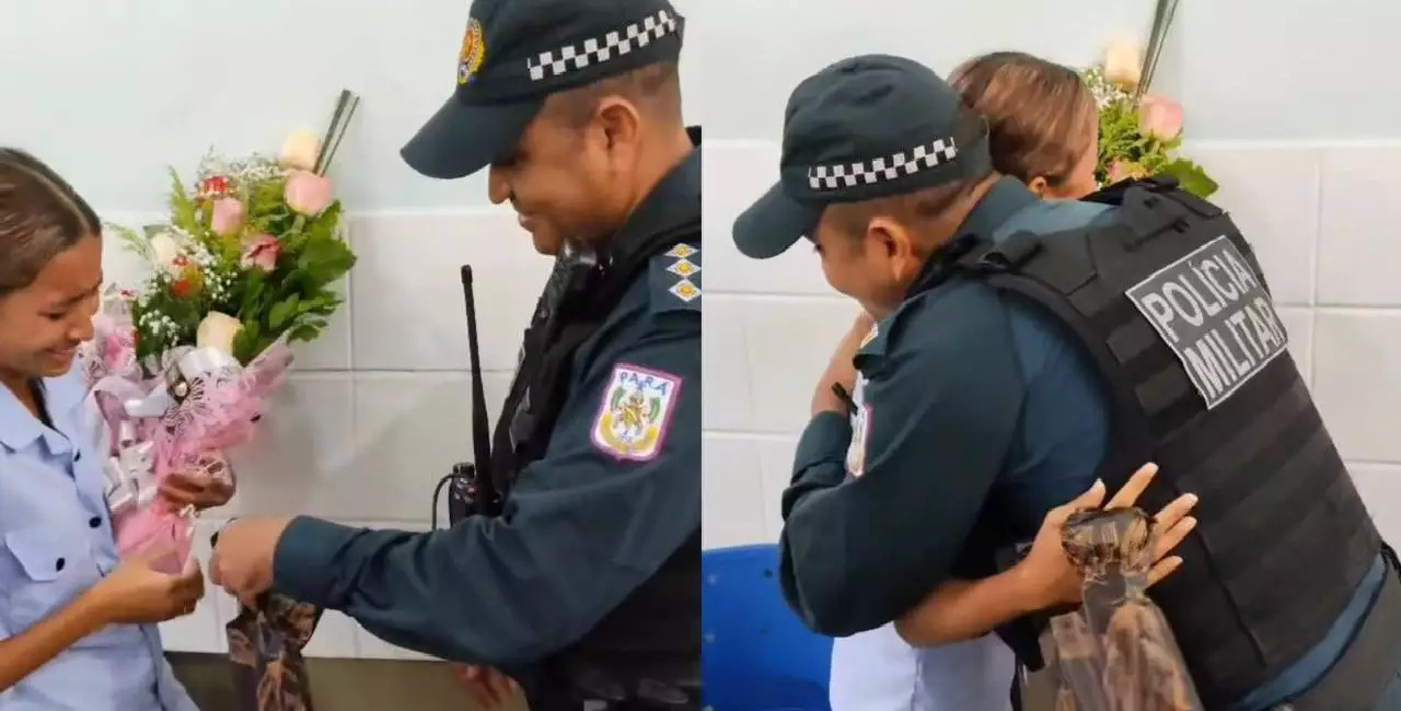 Um momento emocionante tomou conta do Colégio Tenente Rêgo Barros, em Belém, nesta segunda-feira (16), quando o capitão Furtado, da Polícia Militar do Pará (PMPA), decidiu parabenizar sua filha de uma maneira especial pelo seu aniversário de 15 anos. Escolhendo a escola da adolescente como cenário, o policial entrou na sala de aula com flores e chocolate, levando a jovem às lágrimas de emoção.