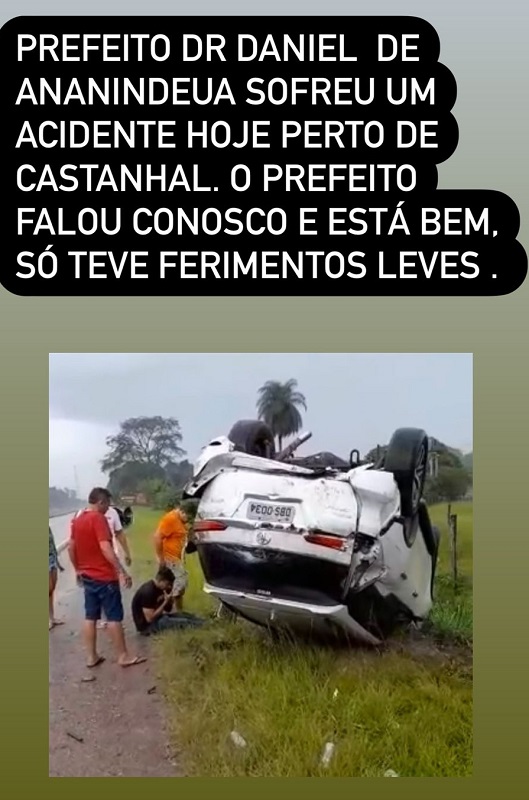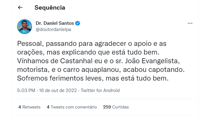 “Pessoal, passando para agradecer o apoio e as orações, mas explicando que está tudo bem. Vínhamos de Castanhal eu e o sr. João Evangelista, motorista, e o carro aquaplanou, acabou capotando. Sofremos ferimentos leves, mas está tudo bem. Eu, em casa, e ele recebendo curativos no hospital, mas nada grave, graças a Deus”.