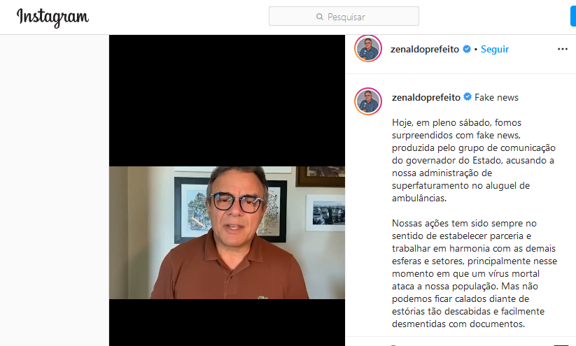 Publicação – O prefeito escreveu em seu Instagram: “Hoje, em pleno sábado, fomos surpreendidos com fake news, produzida pelo grupo de comunicação do governador do Estado, acusando a nossa administração de superfaturamento no aluguel de ambulâncias. Nossas ações têm sido sempre no sentido de estabelecer parceria e trabalhar em harmonia com as demais esferas e setores, principalmente nesse momento em que um vírus mortal ataca a nossa população. Mas não podemos ficar calados diante de estórias tão descabidas e facilmente desmentidas com documentos (…)”. ⠀