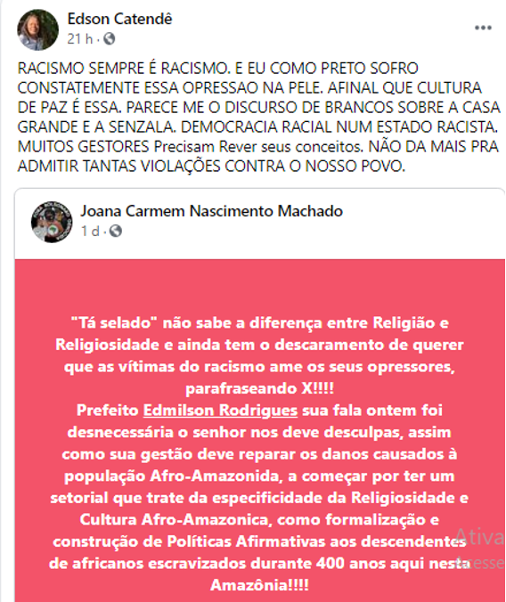 O prefeito Edmilson Rodrigues (PSOL) e a organização do o programa de Participação Cidadã da Prefeitura de Belém, intitulado de “Tá Selado“, estão sendo alvos de críticas nas redes sociais. A polêmica começou quando diversas lideranças afro-religiosas relataram que o evento virtual realizado na última terça-feira, 22, foi uma demonstração de desorganização e desrespeito com as casas de matriz africana da cidade.