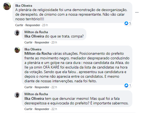 Através de publicações no Facebook, internautas demonstraram indignação com a forma em que o assunto foi abordado na plenária virtual. “A plenária de religiosidade foi uma demonstração de desorganização, de desrespeito, de cinismo com a nossa representante. Não vão calar nosso território!!!!”, escreveu uma ativista na página na web.