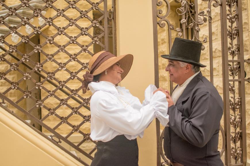 Atores caracterizados de Francisco Bolonha e Alice Tem-Brink, moradores do antigo imóvel, receberam os convidados (foto de Fernando Sette/ Comus)
