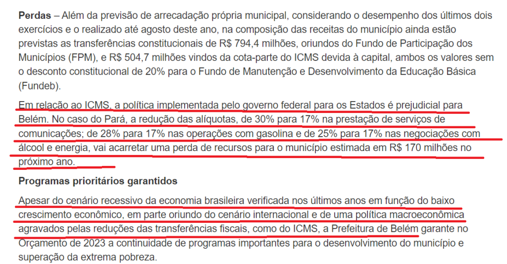 No entanto, chama atenção um trecho específico da matéria da Agência Belém, onde há uma crítica ao projeto de lei do governo federal que reduziu a indecorosa alíquota do ICMS nos setores de combustíveis, energia elétrica e telecomunicações.