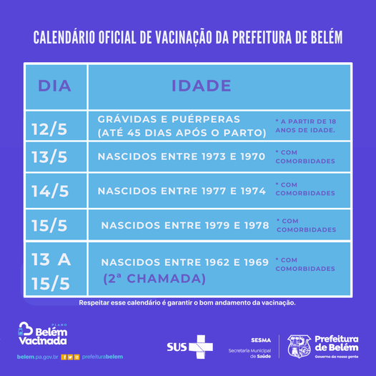 O Plano Belém Vacinada segue avançando na capital paraense. O novo cronograma será iniciado nesta quarta-feira, 12, com a vacinação de grávidas e puérperas (até 45 dias após o parto), a partir de 18 anos de idade, independente de comorbidade; e segue até sábado, 15, com a vacinação das pessoas com comorbidades conforme o cronograma.