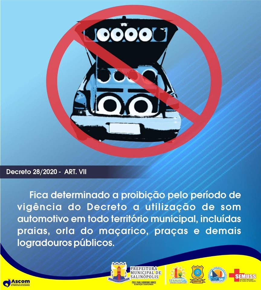 A prefeitura de Salinas editou um novo decreto nesta quinta-feira, 23, proibindo a presença de sons automotivos em todo o território municipal, seja nas praias, orla do maçarico, praças e demais logradouros públicos . A medida visa evitar aglomerações.
