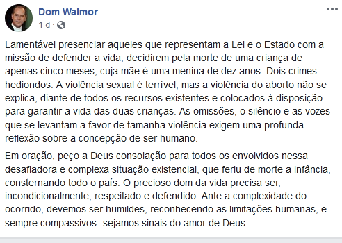 O arcebispo dom Walmor, presidente da Conferência Nacional dos Bispos do Brasil (CNBB), afirmou que a interrupção legal da gravidez feita em uma criança de 10 anos vítima de estupro é um “crime hediondo” e disse que a “violência do aborto não se explica”.