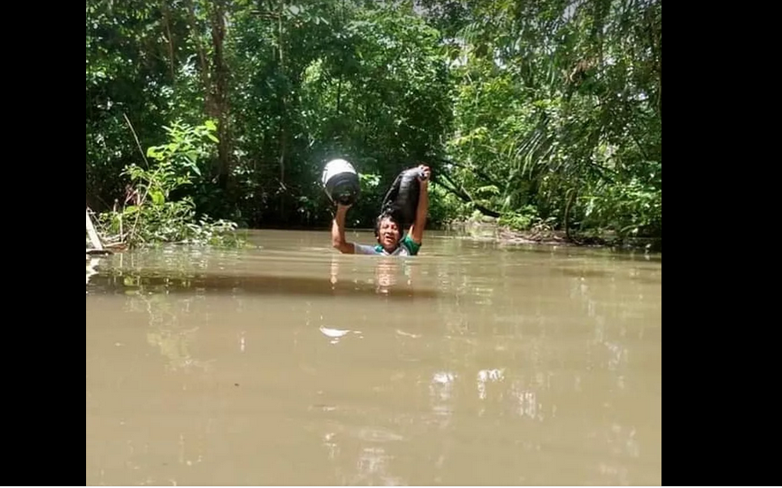 “Para imprimir as atividades a gente vai de moto até o igarapé cheio. Chegando lá tem que procurar um meio para atravessar sem molhar o material dos alunos. Do outro lado, pega a bicicleta, depois larga e vai caminhando pela estrada submersa pela água. Ainda corremos risco com animais como jacarés e cobras.”