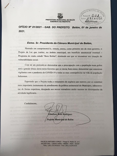 Projeto – “O prefeito mudou de ideia e preferiu apresentar um projeto de autoria do executivo. Não se sabe, porém, o que diz o texto do projeto, quantas famílias serão beneficiadas, datas dos pagamentos, fonte de custeio e como os beneficiários serão habilitados. Durante reunião com o governador Helder Barbalho, no começo de dezembro passado, ficou decidido que o governo estadual e a prefeitura fecharão uma parceria. O que se sabe apenas é que a maior parte dos recursos virá dos cofres estaduais.