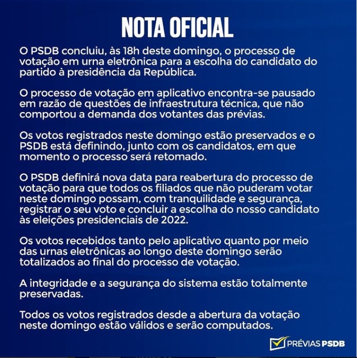 Em nota divulgada nas redes sociais, o PSDB informou que “os votos recebidos tanto pelo aplicativo quanto por meio das urnas eletrônicas ao longo deste domingo serão totalizados ao final do processo de votação”.