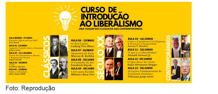 Após alguns anos de estudo, decidi organizar esse curso para compartilhar o conhecimento adquirido com outros indivíduos. Sobre o curso em si, ele está estruturado em 3 módulos principais, onde apresento os autores e suas obras mais importantes em uma espécie de linha do tempo, passando pelos clássicos, pelos grandes economistas do século XX e finalizando com os pensadores contemporâneos que enriqueceram a ideologia liberal. Os alunos que adquirirem o curso terão acesso a 14 aulas com mais de 30 horas de conteúdo inédito, aulas em vídeo e em MP3, certificado de conclusão aceito em todas as universidades do Brasil e a possibilidade de participar de um grupo de discussão privado para resolução de dúvidas.