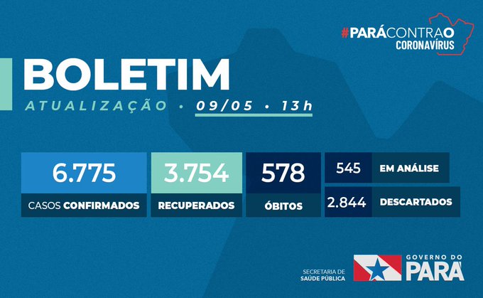 Agora são 6.775 casos e 578 óbitos no Pará. O detalhamento de casos e óbitos, com gênero, idade e cidade, que estava sendo feito diretamente no Twitter da Sespa-PA, agora, está disponível apenas no link http://covid-19.pa.gov.br. Esta atualização foi feita neste sábado, 9, às 12h30.