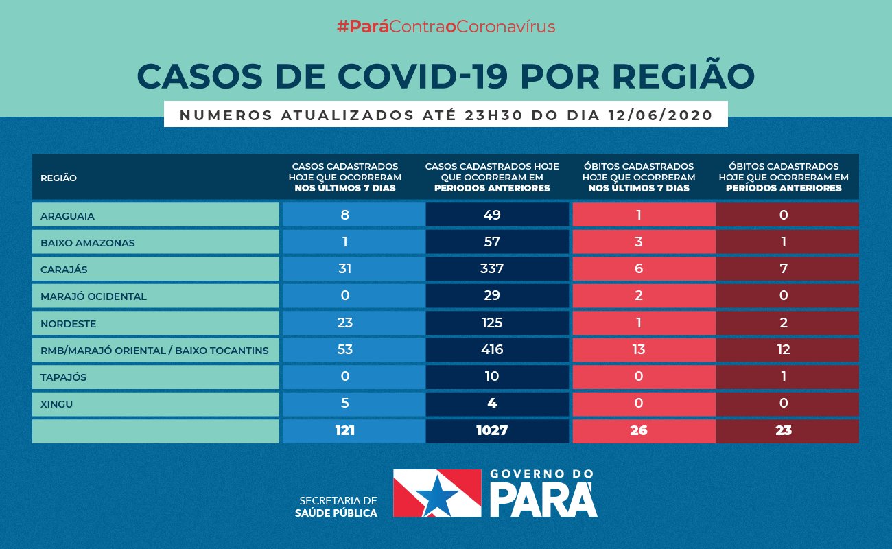 A Secretaria de Estado de Saúde (Sespa) mudou a forma de divulgação sobre os números do novo coronavírus no estado do Pará, e confirma mais 121 novos casos de Covid-19 e 26 óbitos cadastrados hoje [sexta-feira, 12] que ocorreram nos últimos sete dias.
