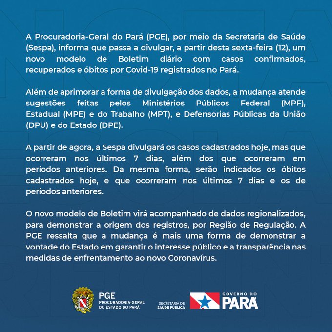 Divulgação – A Procuradoria-Geral do Pará (PGE), por meio da Secretaria de Saúde (Sespa), informa que passou a divulgar, desde a sexta-feira, 12, um novo modelo de boletim diário com casos confirmados, recuperados e óbitos por Covid-19 registrados no Pará.