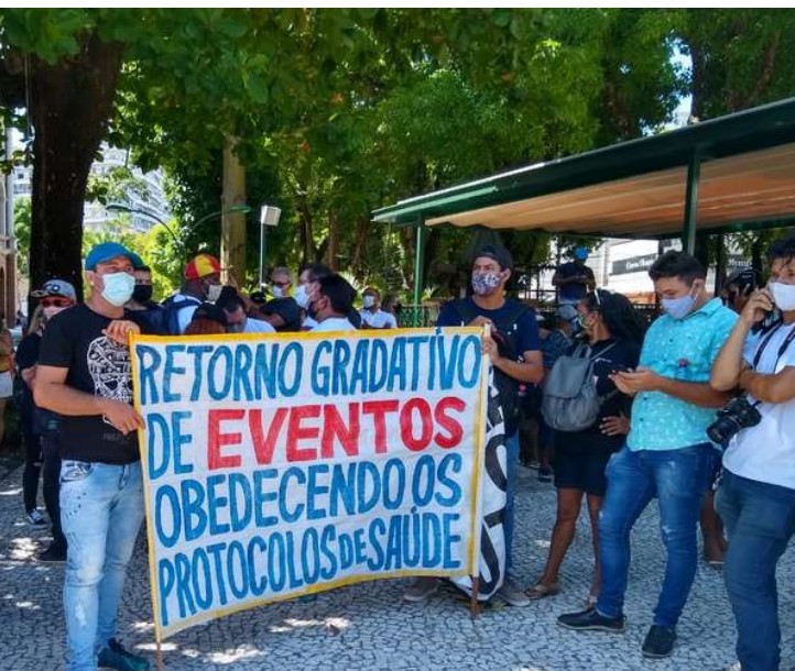 Em agosto, trabalhadores de eventos noturnos realizam manifestação pacífica em frente ao Theatro da Paz, localizado na Praça da República, em protesto pela retomada dos eventos em Belém. Cerca de 300 pesoas que atuam no setor participaram do protesto reivindicando a reabertura gradativa das casas de shows e das aparelhagens sonoras. Porém, a Prefeitura Municipal não cedeu à pressão na época, alegando que ainda havia riscos de proliferação da covid-19.