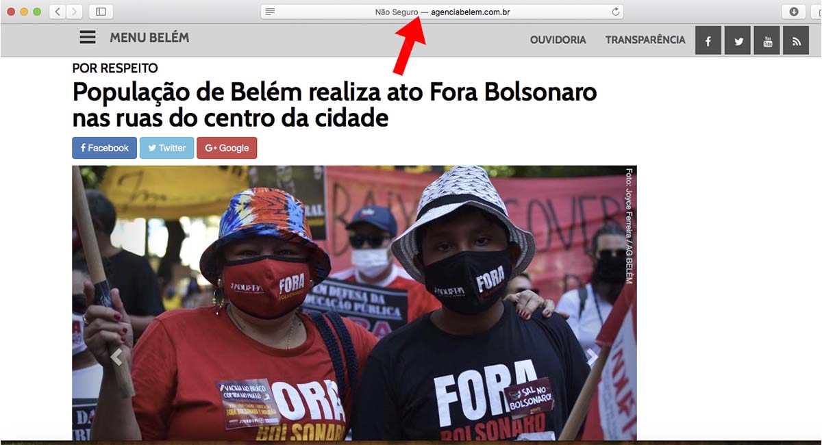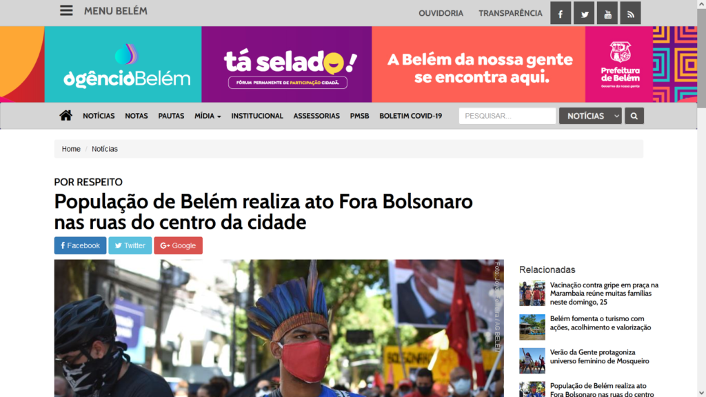 No último sábado, 24, a Agência Belém publicou matéria com o título “População de Belém realiza ato Fora Bolsonaro nas ruas do centro da cidade” em que destacou a atuação de movimentos sociais, grupos políticos e sindicatos atrelados à esquerda em um protesto que aconteceu nas ruas de Belém contra o governo Bolsonaro, assunto este que está longe da função do site institucional que é informar a população belenense sobre serviços e ações da prefeitura municipal, além de outros assuntos de interesse público.