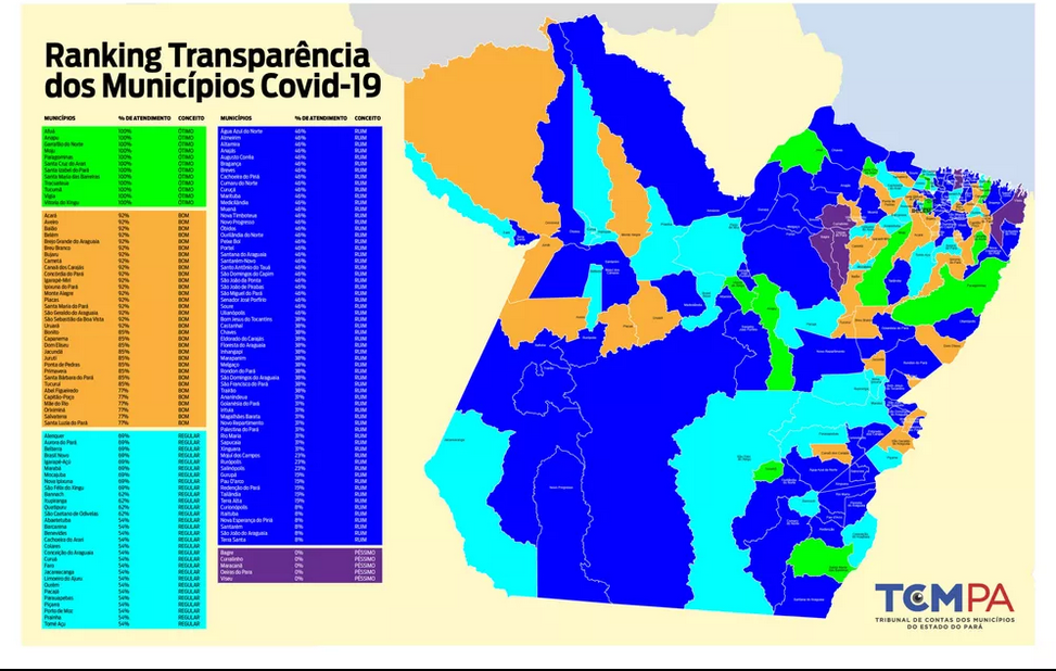 Um estudo divulgado na última sexta-feira (24) pelo Tribunal de Contas dos Municípios do Pará (TCM-PA) apontou que 48% das cidades do estado tiveram desempenho abaixo do aceitável em relação a transparência de gastos durante a pandemia de Covid-19. De acordo com o levantamento do TCM, 69 dos 144 municípios do Pará tiveram classificação “ruim” ou “péssima” em relação a transparência. A análise levou em consideração os portais das prefeituras de cada cidade.