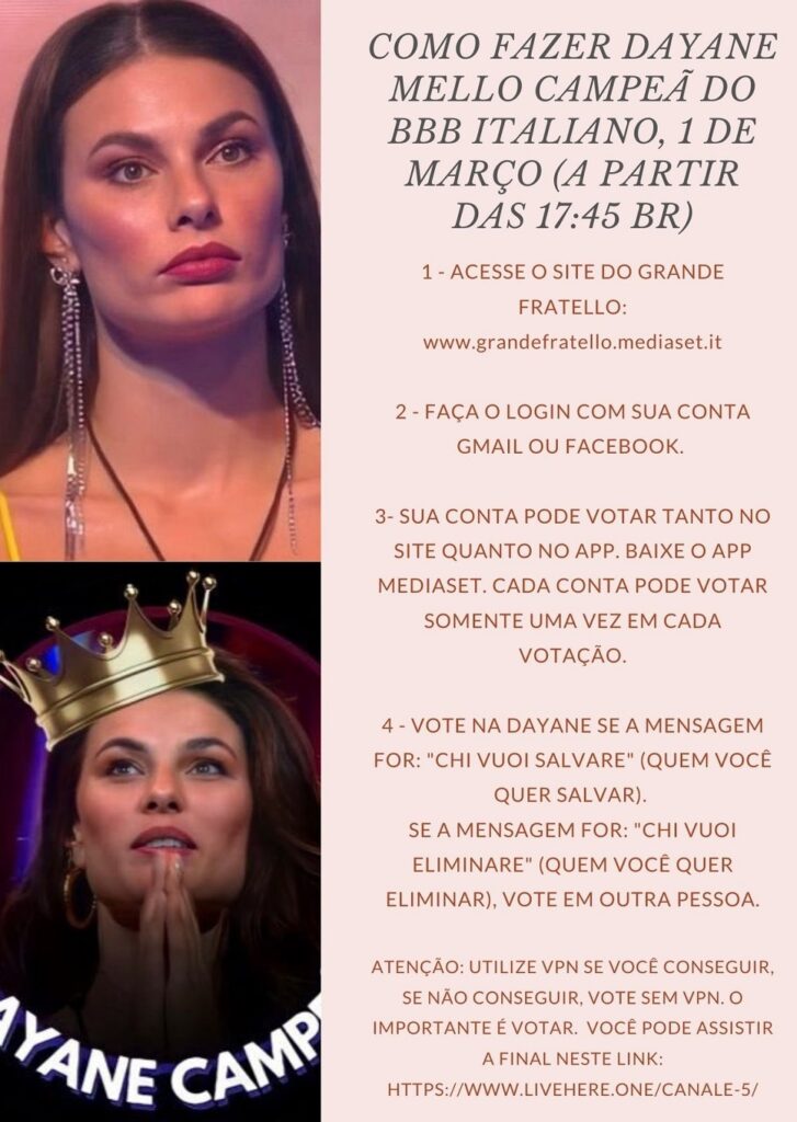 Veja como você pode ajudar à Dayane a vencer a versão 2021 do BBB Itália ou como ele é conhecido, “Grande Fratello”.