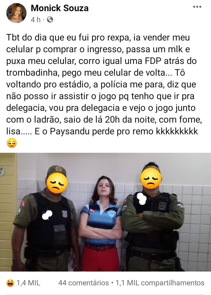 Lá na delegacia Monick encontra o bandido que roubou seu celular. “Vou para delegacia e vejo o jogo junto com o ladrão, saio de lá 20h da noite, com fome, lisa… E o Paysandu perde pro remo kkkkkkkk”, relatou em suas redes sociais.