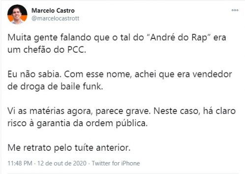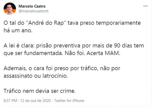 Candidato a vereador em São Paulo pelo Novo, o empresário Marcelo Castro defendeu a decisão de Marco Aurélio que mandou soltar o traficante André do Rap. Depois, se desculpou.