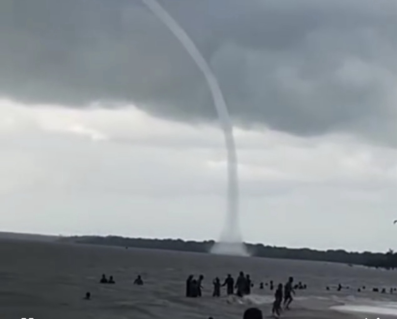 a tarde deste sábado (26), um fenômeno meteorológico raro e de grandes proporções chamou a atenção de moradores e banhistas na Praia do Belo Paraíso, localizada no distrito de Outeiro, em Belém.