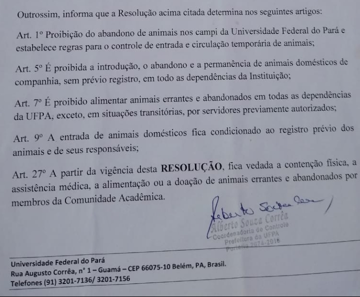 Além de proibir a entrada dos animais na instituição, a UFPA proibiu também que os animais que já estejam na instituição ou que foram abandonados nas dependências da Universidade, sejam alimentados enquanto estiverem dentro da mesma.