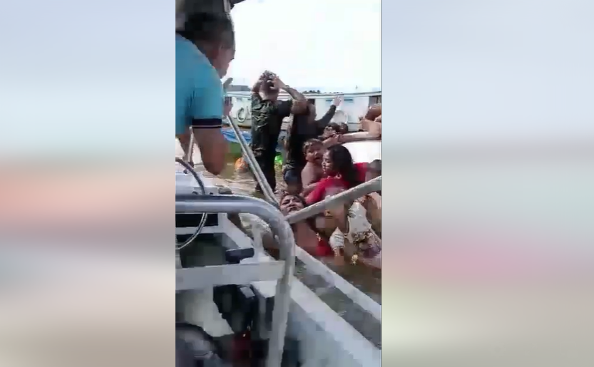 Embarcações de ribeirinhos se aproximam e dão suporte para retirar as pessoas do rio.