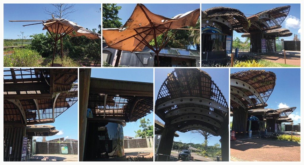No entanto, alguns desses espaços estão se deteriorando sem manutenção adequada, como a palha da cobertura do pórtico na entrada do Parque, na avenida João Paulo II.