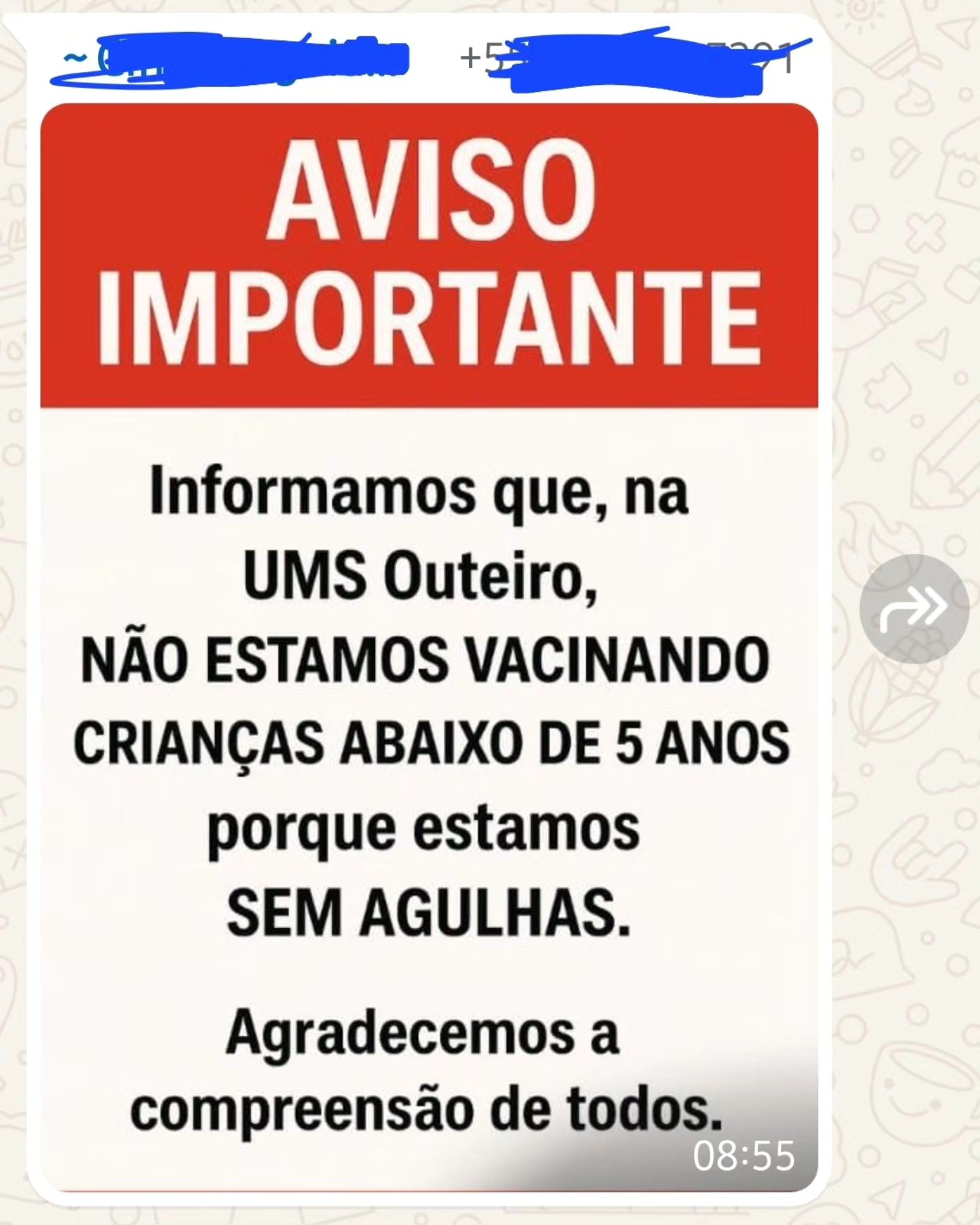 A vacinação infantil na Unidade Básica Municipal de Outeiro, em Belém, foi suspensa na manhã desta quarta-feira (20) devido à falta de agulhas. O caso causa revolta porque ocorre menos de 24 horas após a visita do secretário municipal de Saúde, Dr. Rômulo Nina, ao local, onde havia reforçado a importância de ampliar a cobertura vacinal na região.