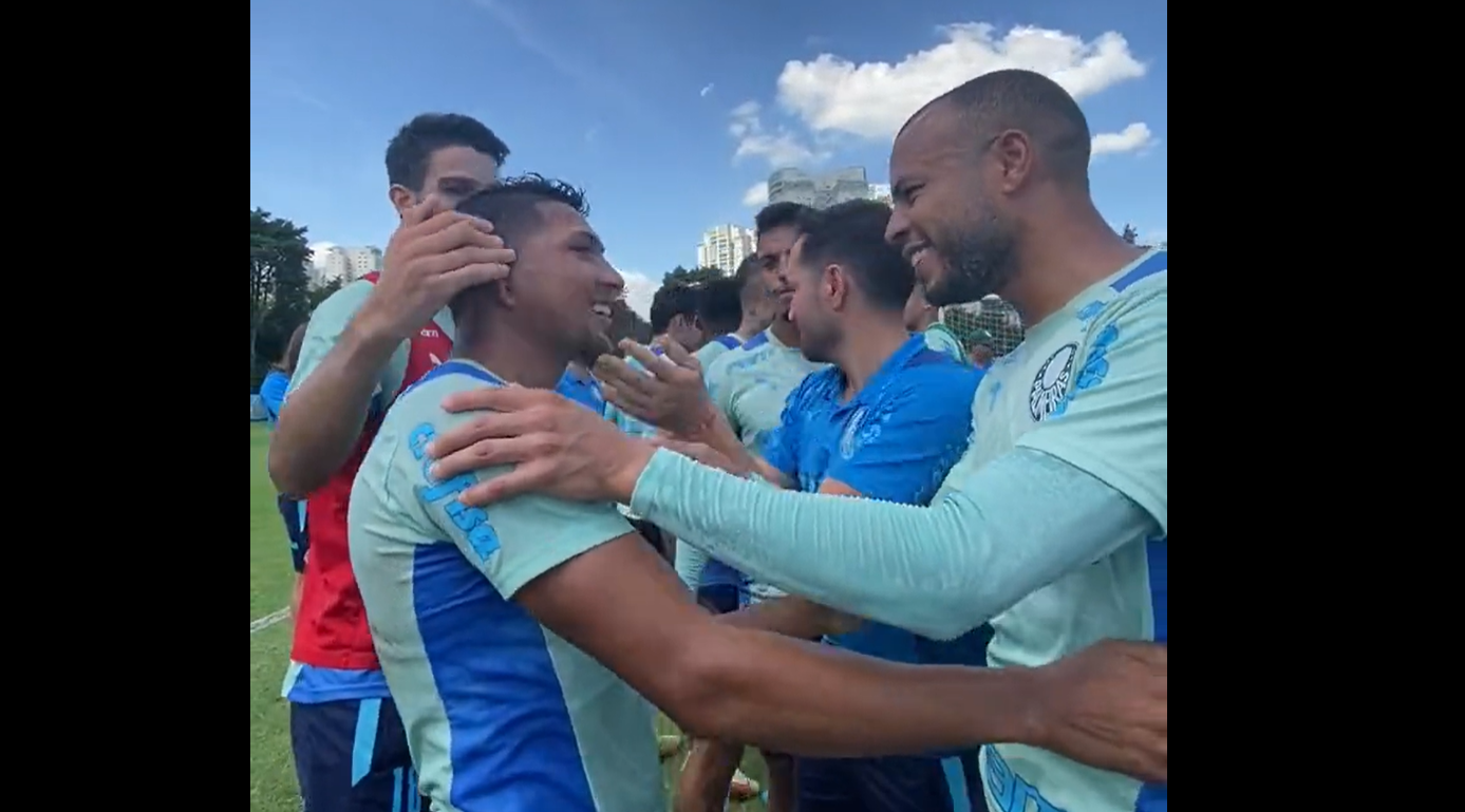 O jogador, natural de Magalhães Barata (PA), é abraçado por vários companheiros de clube ao final do treino. Emocionado, ele mal consegue responder às falas de felicitações dos demais atletas do Verdão.