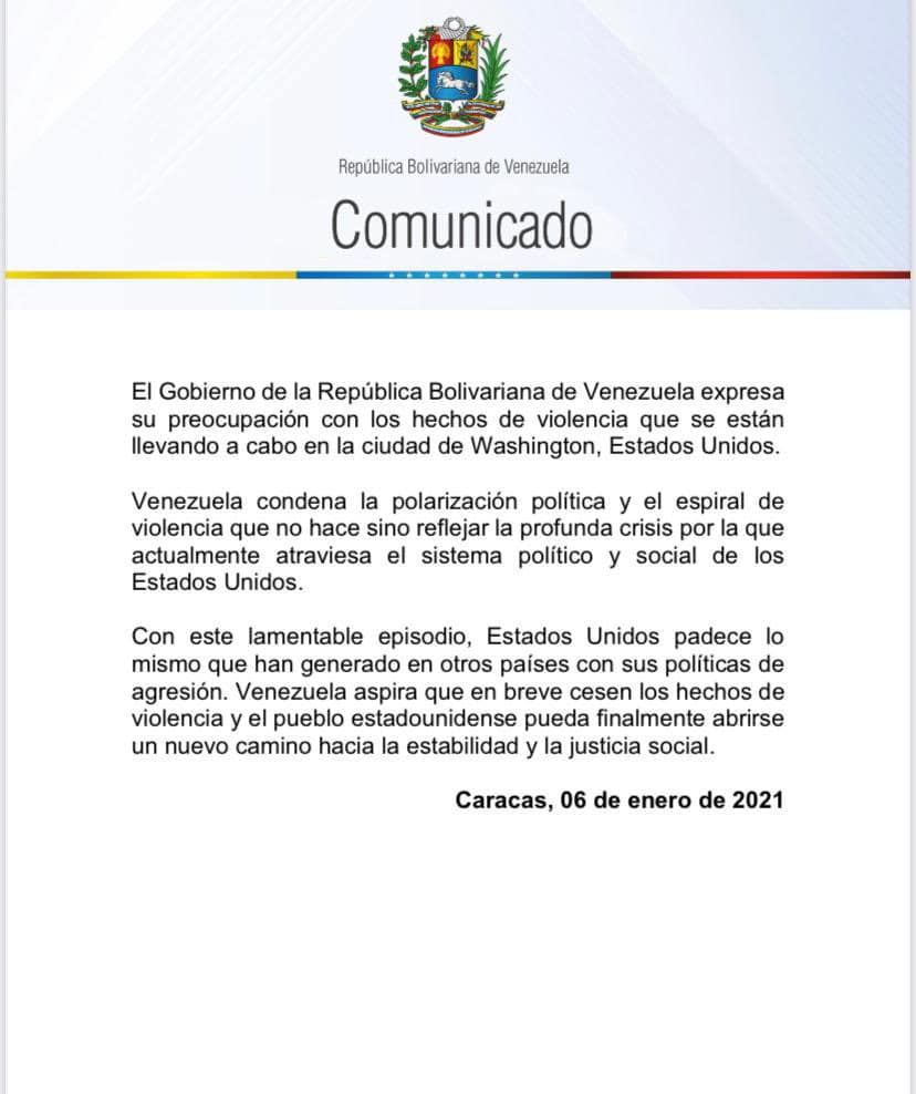 O governo da Venezuela publicou nota oficial supostamente demonstrando preocupação com os protestos e a violência que tomaram Washington nesta quarta-feira, 06.