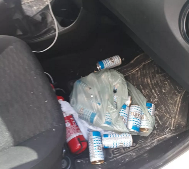 A polícia encontrou várias latas de cervejas dentro do carro que o rapaz dirigia. Joaquim tentou justificar dizendo que o filho toma remédio controlado.